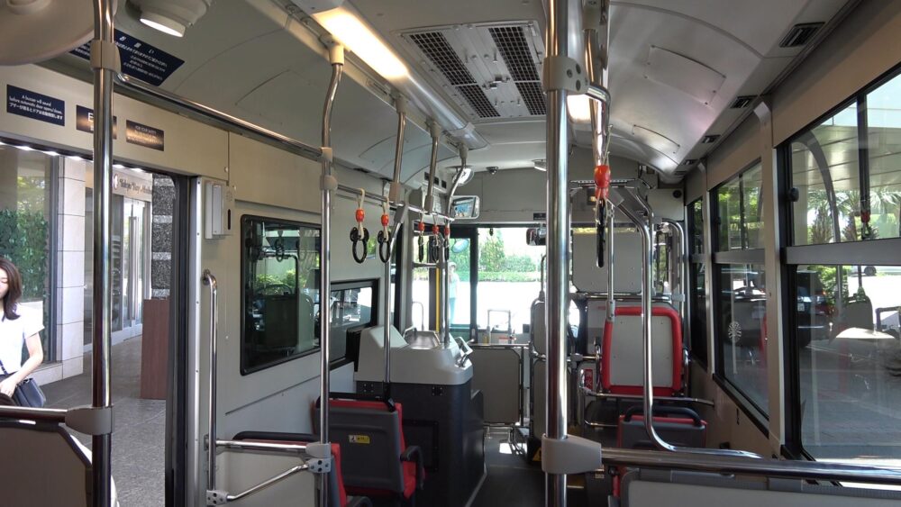 旧タイプのディズニーリゾートクルーザーとは違い、内装は街バスの椅子の配列であまり感動を受けるバスではないようです。