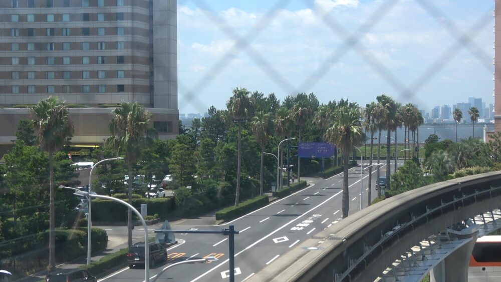 プラットホームの末端(端っこ)まで歩いてくると先程、シャトルバスが運行してきた道を見る事ができます。(左手にヒルトン東京ベイ)