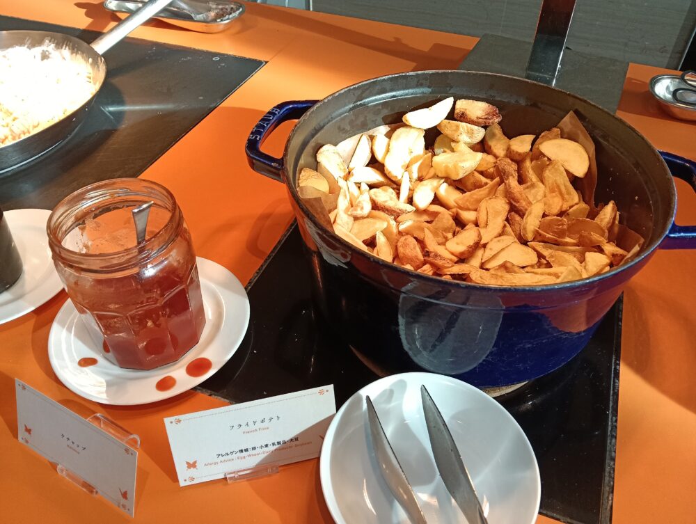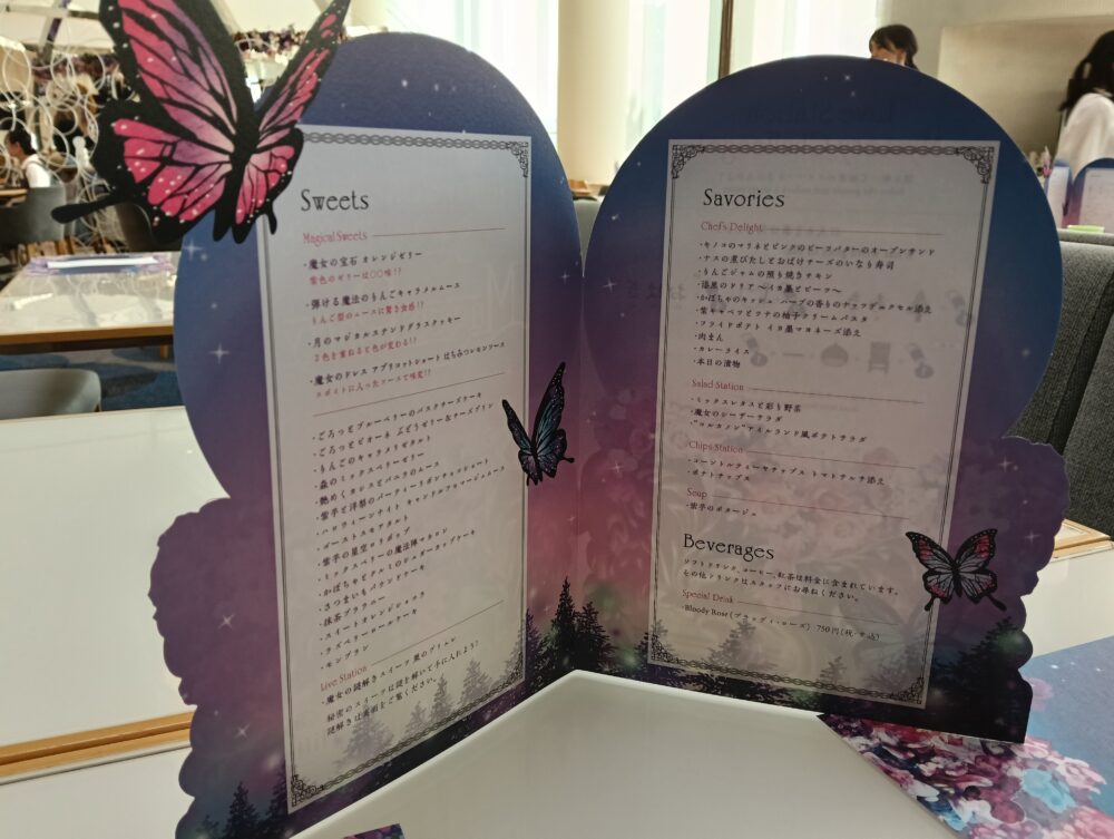 テーブルの上にはビュッフェ料理の品々が書かれたメニュー表が置かれています。