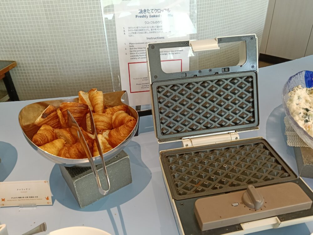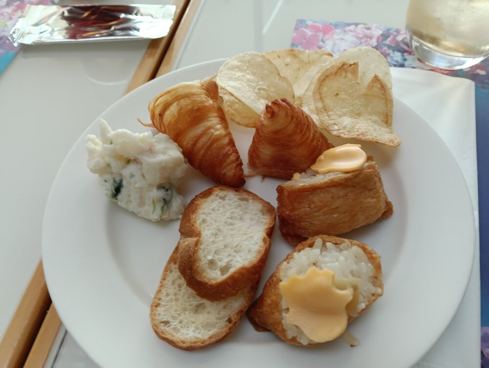 クロッフルを作るには面倒なのでそのままクロワッサンとして食べましたがとても柔らかく頂けました。一口サイズの「ナスの煮びたしとおばけチーズのいなり寿司」はリピートしたくなる一品