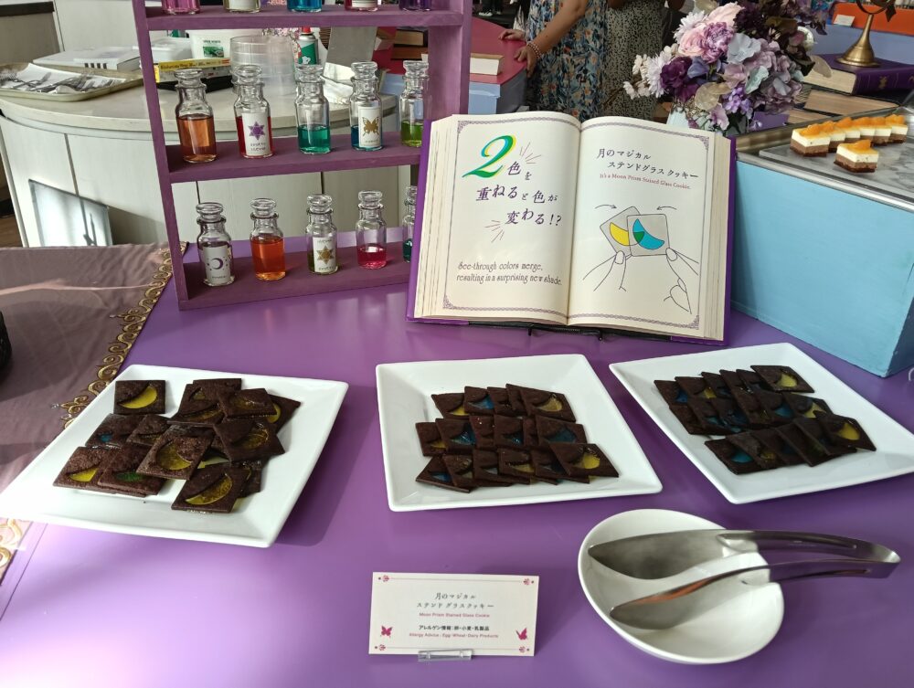 ココアクッキーに飴を流したパリッとした食感が楽しいステンドグラスクッキーは、黄色と水色の2色をご用意。2色を重ねると色が変わるマジカルクッキー(HPより引用)