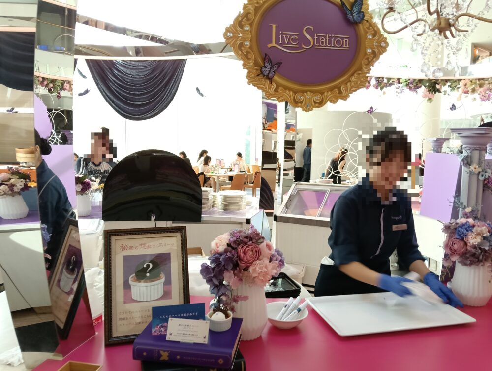ヒルトン東京ベイ(ラウンジ・オー)のデザートビュッフェは毎回テーマが決められておりどの時期に来ても物凄く凝ったデザートに仕上げられておりいつもびっくりさせられています。ライブステーションでは、謎解きスイーツと題し、クイズ形式(メニュー表に記載)でスイーツを当てるといったこれまでにはないスタイルを採用しており面白みあるデザートビュッフェだったと思いました。