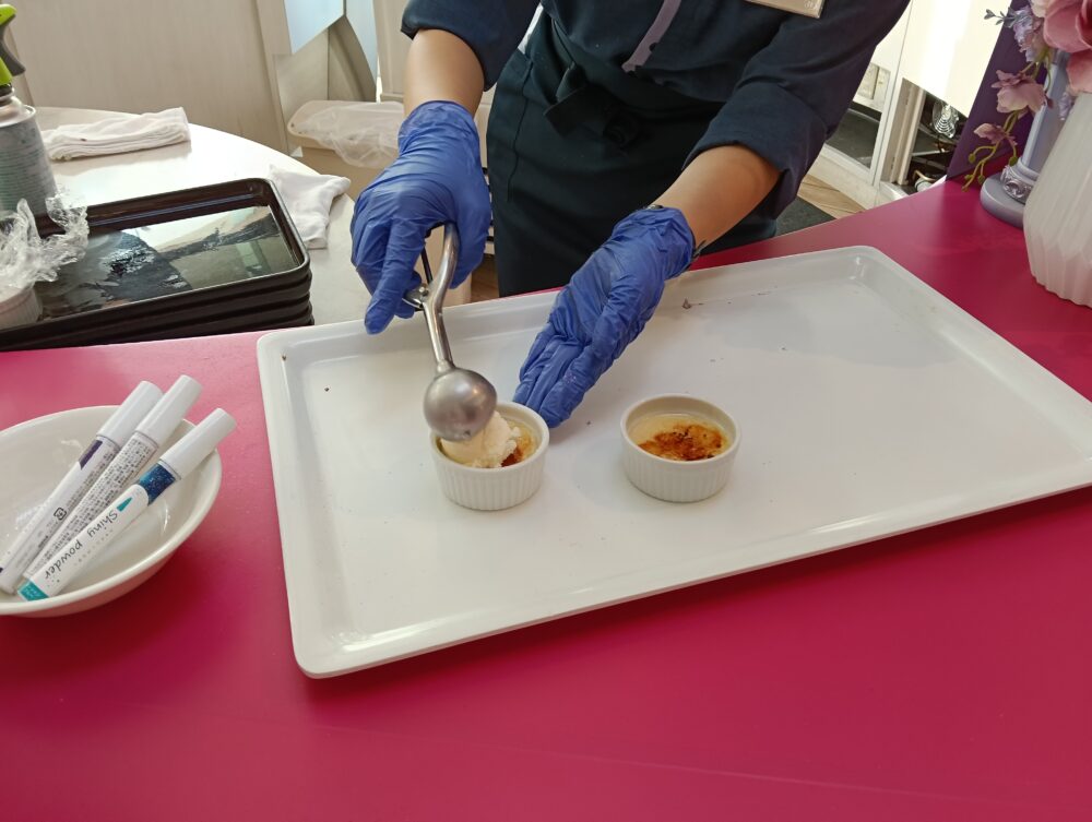 ブリュレの上に綿あめをのせスタッフの方がバーナーで炙り続けると綿あめはなくなりキャラメリゼの香ばしさが出てきます。