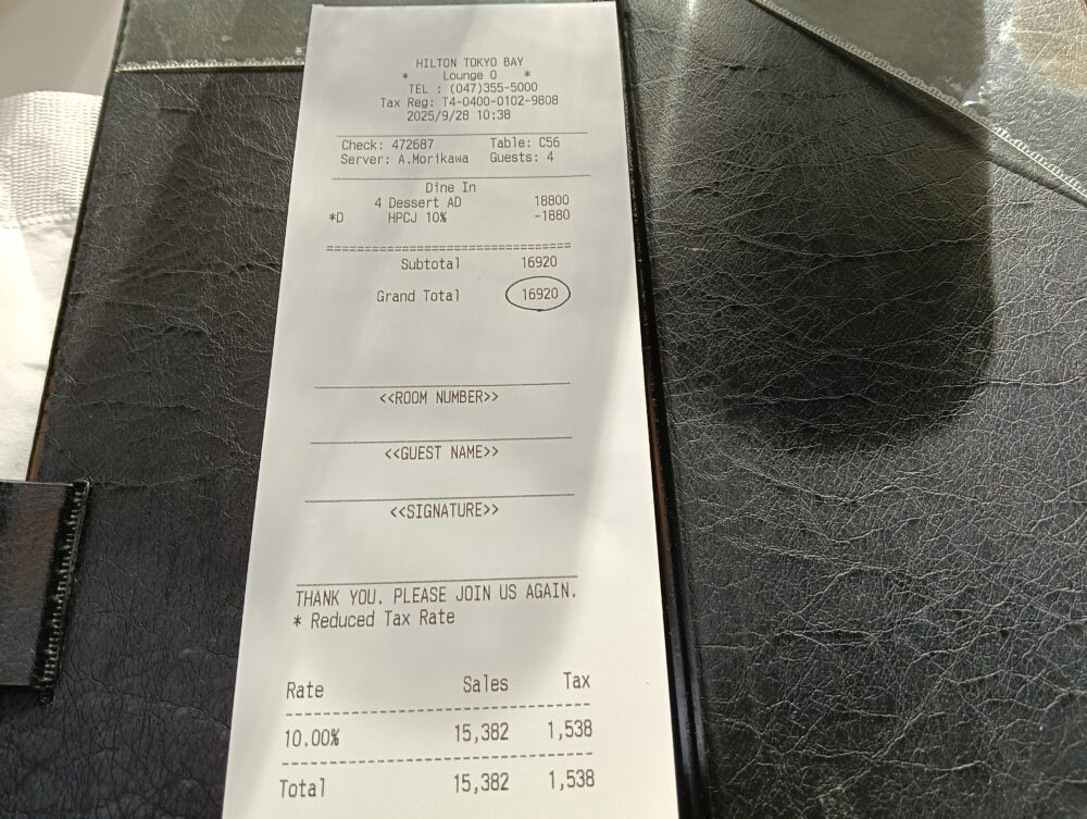 当方はヒルトンオナーズゴールド会員(25%割引適用)なのですが、今回はHPCJの割引券(5000円×2枚)があることから今回の精算についてはHPCJ10%割引でお願いをしました。※宿泊の場合は20%適用(レストランのみ利用の場合は10%適用)