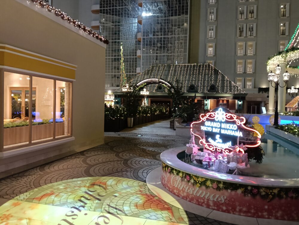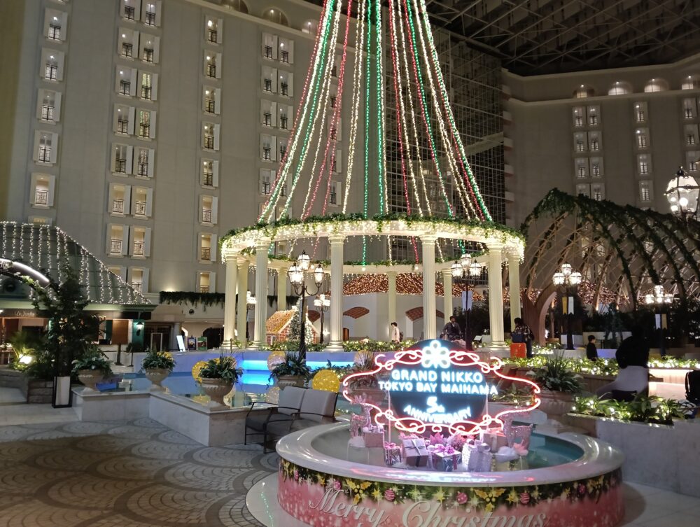 正面玄関の自動ドアを通過すると目の前には大きな空間のアトリウムが現れ、そこには大きなクリスマスツリーを思わせる赤と緑のイルミネーションが目に飛び込んできます。またこちらの「グランドニッコー東京ベイ舞浜」はリブランド(開業)5周年を迎えるとの事で1年を通していろんなイベントが開催されているようです。