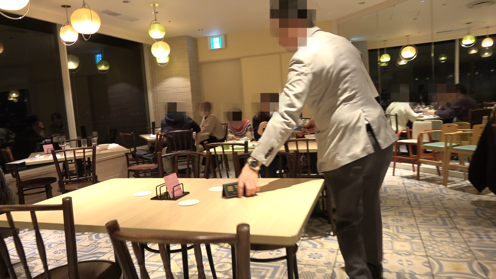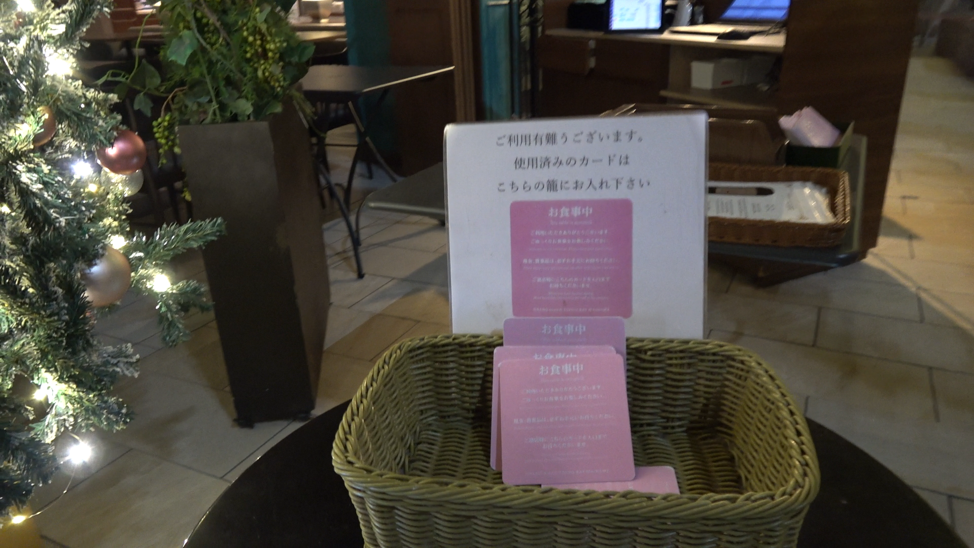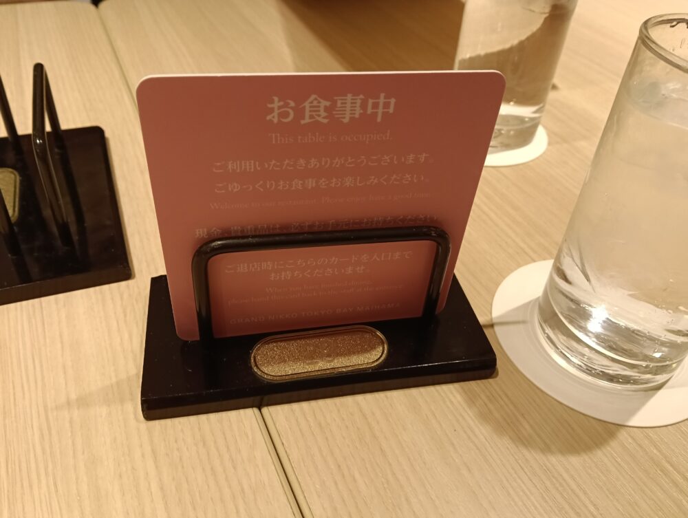食事の最中はこちらの「お食事中」のプレートを設置しておき、退店する際には、レストラン入口にある返却箱へと戻すシステムのようです。