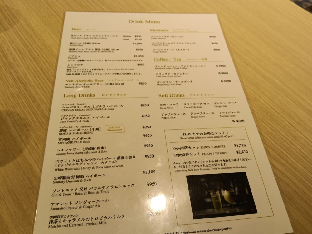 テーブルの上には、アルコール類(単品ソフトドリンク)のメニュー表が置いてあるので個別で何か飲みたい場合はこちらのメニュー表から注文することになります。