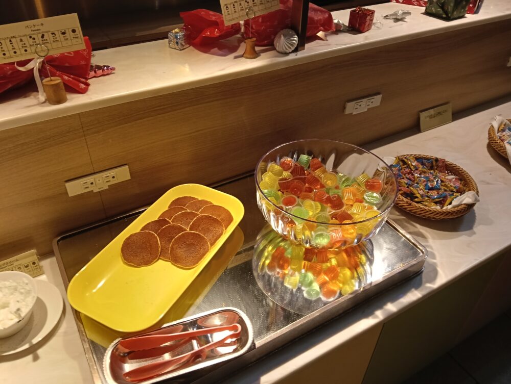 ゼリー、パンケーキ(ホイップクリーム、メープルシロップ)