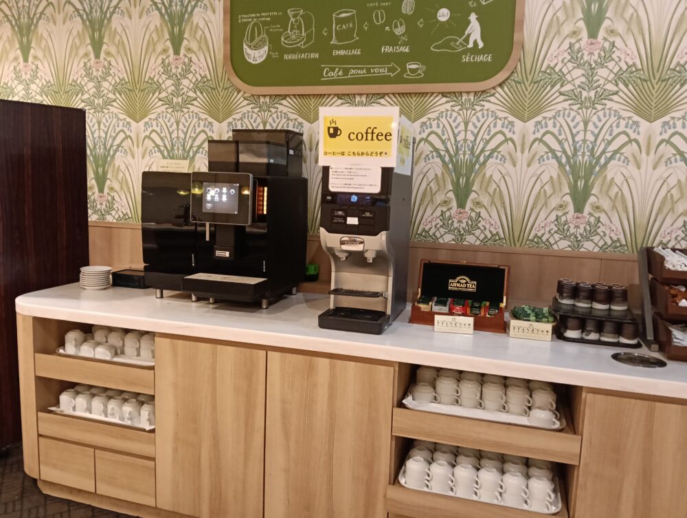 ・左側のコーヒーマシン(コーヒー、カプチーノ、カフェラテ、エスプレッソなどを選択可能)