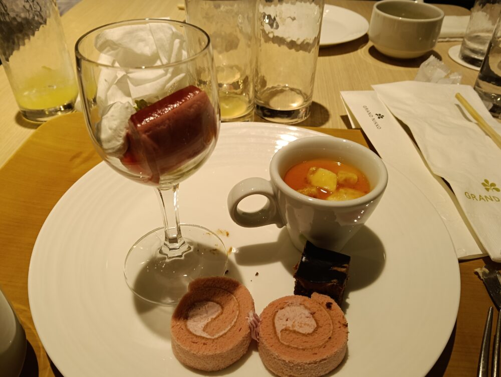 ・「プディングディプロマット」(写真中央のカップデザート)は、滑らかなカスタードプリンのコクと、ふんわりしたスポンジ、生クリームの軽やかさが重なり合い上品な味わい。