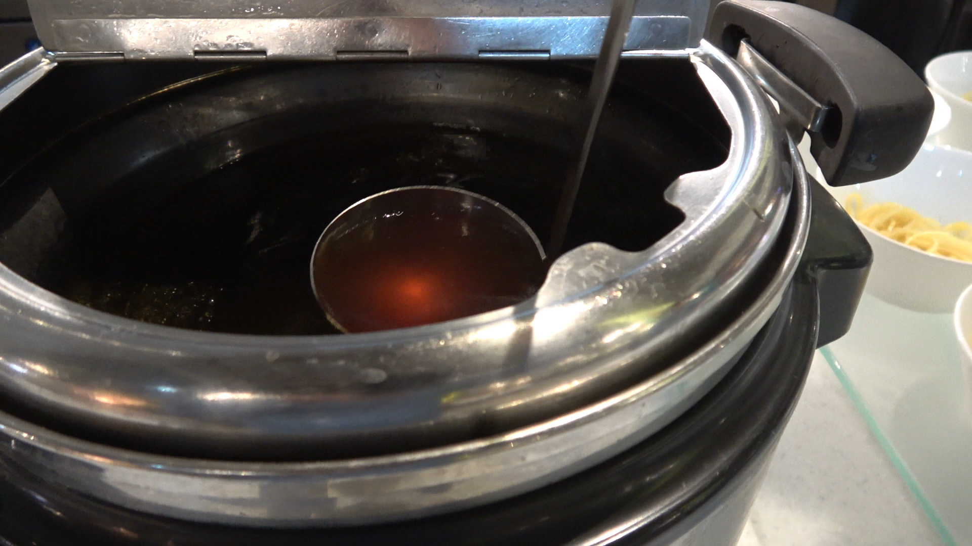 お皿に入っているラーメンの器を受け取りラーメンのスープを注ぎます。