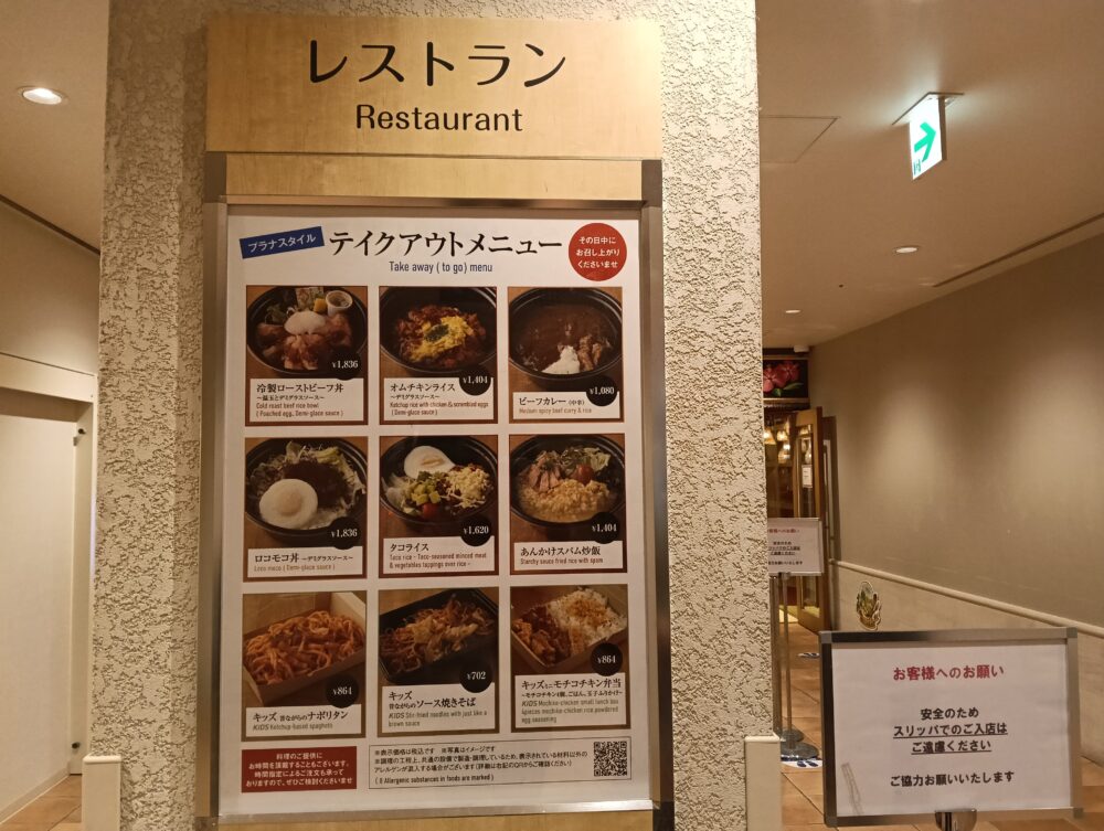 レストラン入口近くの柱にテイクアウトメニューの案内掲示がされていてるので参考にすると良いと思います。※もう少し詳しくメニューを見たい場合はテイクアウトメニュー←こちらをクリック