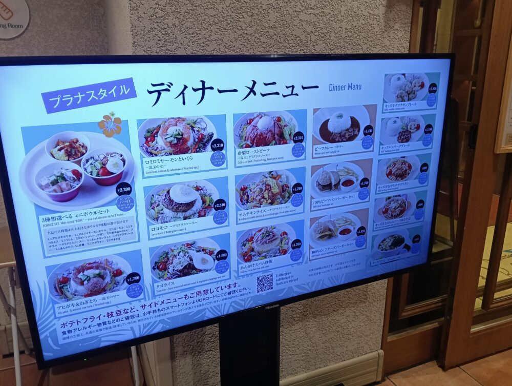レストラン内で食事が出来るディナーメニュー一覧を大型液晶テレビで表示