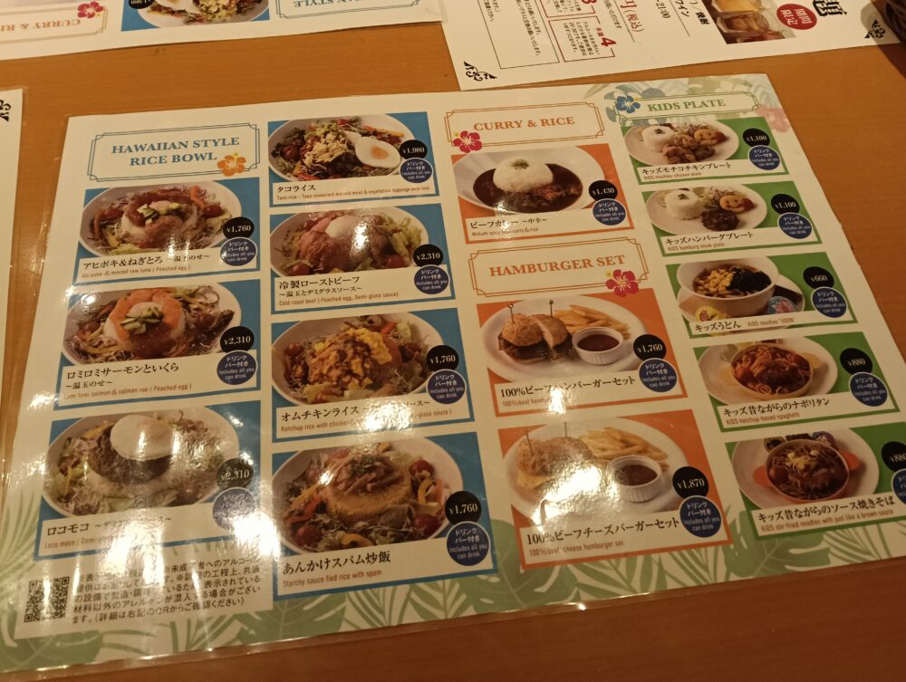 メニューには、ハワイアンスタイルライスボウル、カレーライス、ハンバーガーセット、キッズプレートの中から選ぶことになります。全てのメニューにドリンクバー&味噌汁&コーンスープ付き