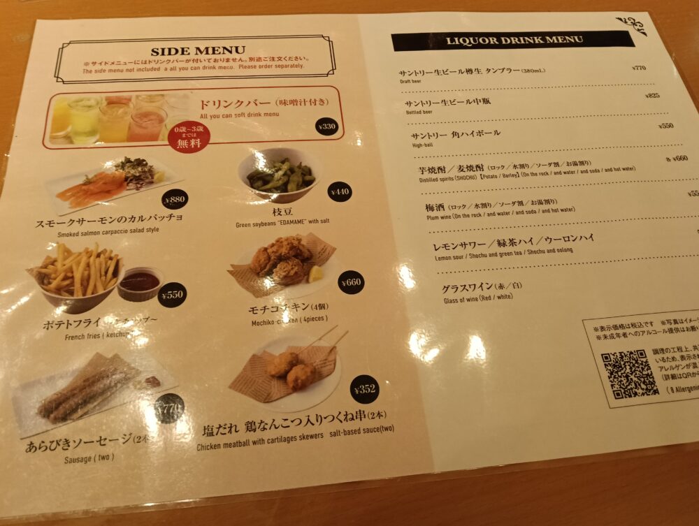 6種類のサイドメニューもありその他アルコールメニューもあるので必要に応じて注文可能