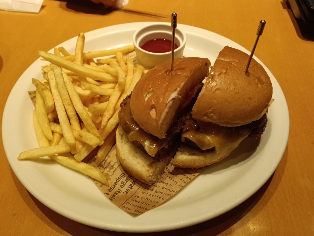 まず目を引くのは、ふっくらとしたバンズに挟まれた分厚いビーフパティ。さらに、とろけたチーズがいい具合に絡み合い、食欲を一気に加速させます。また半分にカットされているので食べやすく、断面からは肉汁とチーズのコクがじんわりと滲み出てきます。ポテトの量も多く女性にはちょっときついぐらいの量で覚悟が必要な一品
