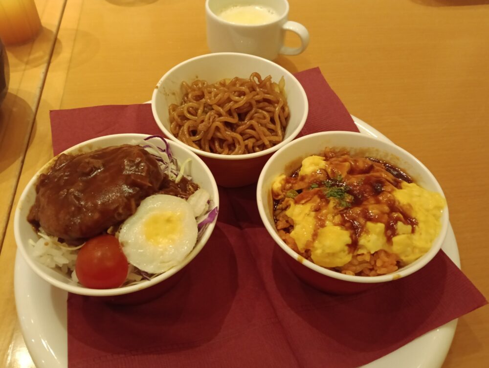 ①ミニロコモコ、②オムチキンライス(デミグラスソース)③ミニやきそば